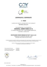 La certificazione di prodotto ReMade in Italy® è richiesta, riconosciuta ed apprezzata dal mercato, il quale è sempre più attento ad orientarsi verso un sistema economico basato sull’Economia Circolare e quindi all’acquisto di prodotti con contenuto di materiale reintrodotto nel ciclo economico attraverso il riciclo / recupero. ReMade in Italy® è sotto accreditamento ACCREDIA, a garanzia di indipendenza e trasparenza, ed attesta la quota di “materiale riciclato e di sottoprodotti” contenuta nei prodotti in commercio. Si basa su uno schema di tracciabilità, conforme al Codice Appalti e ai CAM (Criteri ambientali minimi) per offrire la massima garanzia al consumatore finale (pubblico o privato) sulla quota di prodotto che deriva dal recupero di materia.