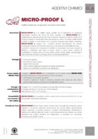 MICRO-PROOF L è un additivo liquido specifico per la realizzazione di calcestruzzi impermeabili, conforme alla norma EN 934-2 prospetto T.9. MICRO-PROOF L è caratterizzato da particolari principi attivi che consentono, attraverso la reazione chimica con i composti minerali e l’umidità della matrice del calcestruzzo fresco, di formare cristalli insolubili in grado di sigillare le micro-fessure che si possono presentare nella matrice cementizia.